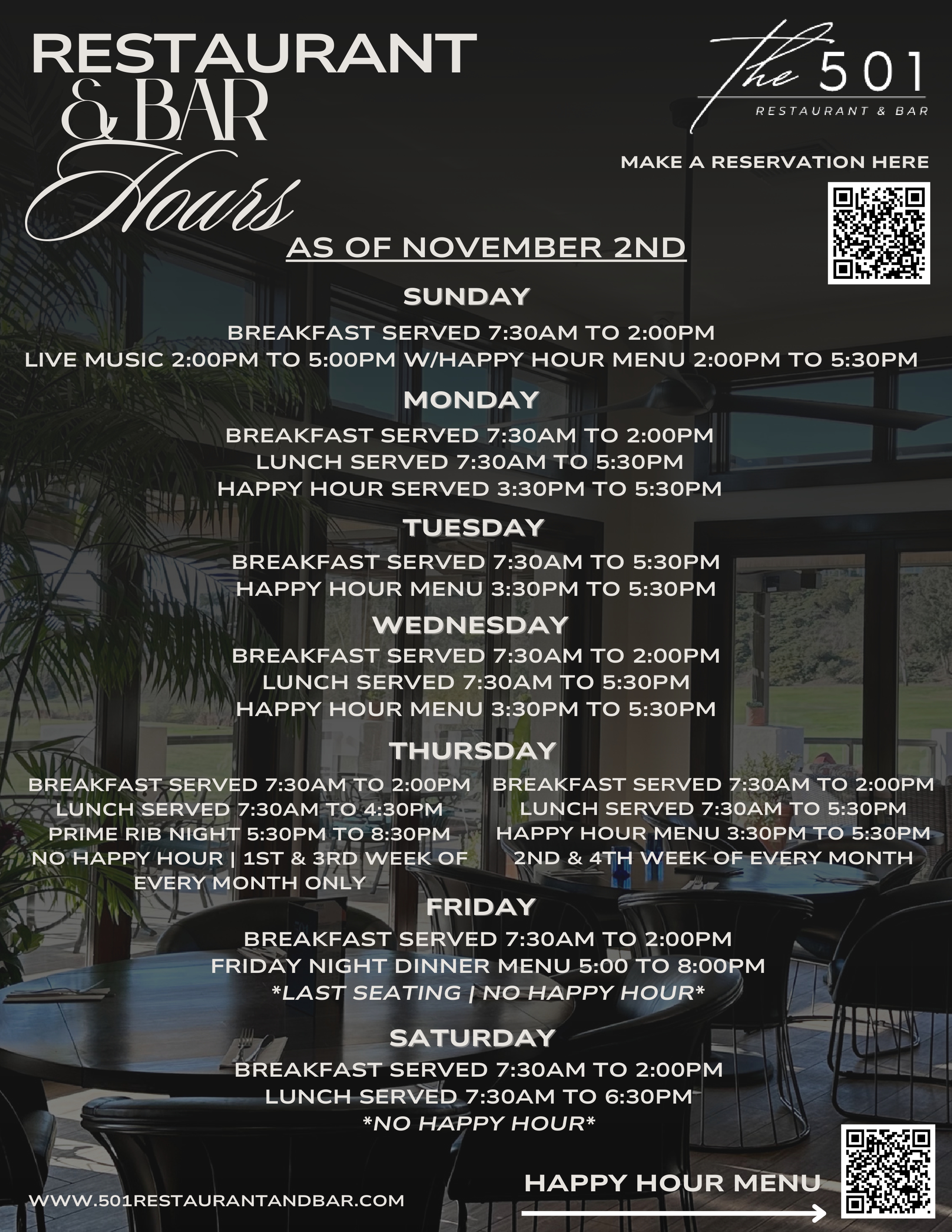Whether you’re looking for a romantic dinner for two, a lively night out with friends, or a memorable venue for your next event, the 501 Restaurant & Bar welcomes you to indulge in a culinary experience like no other. Join us today and discover why we’re more than just a restaurant—we’re a destination.